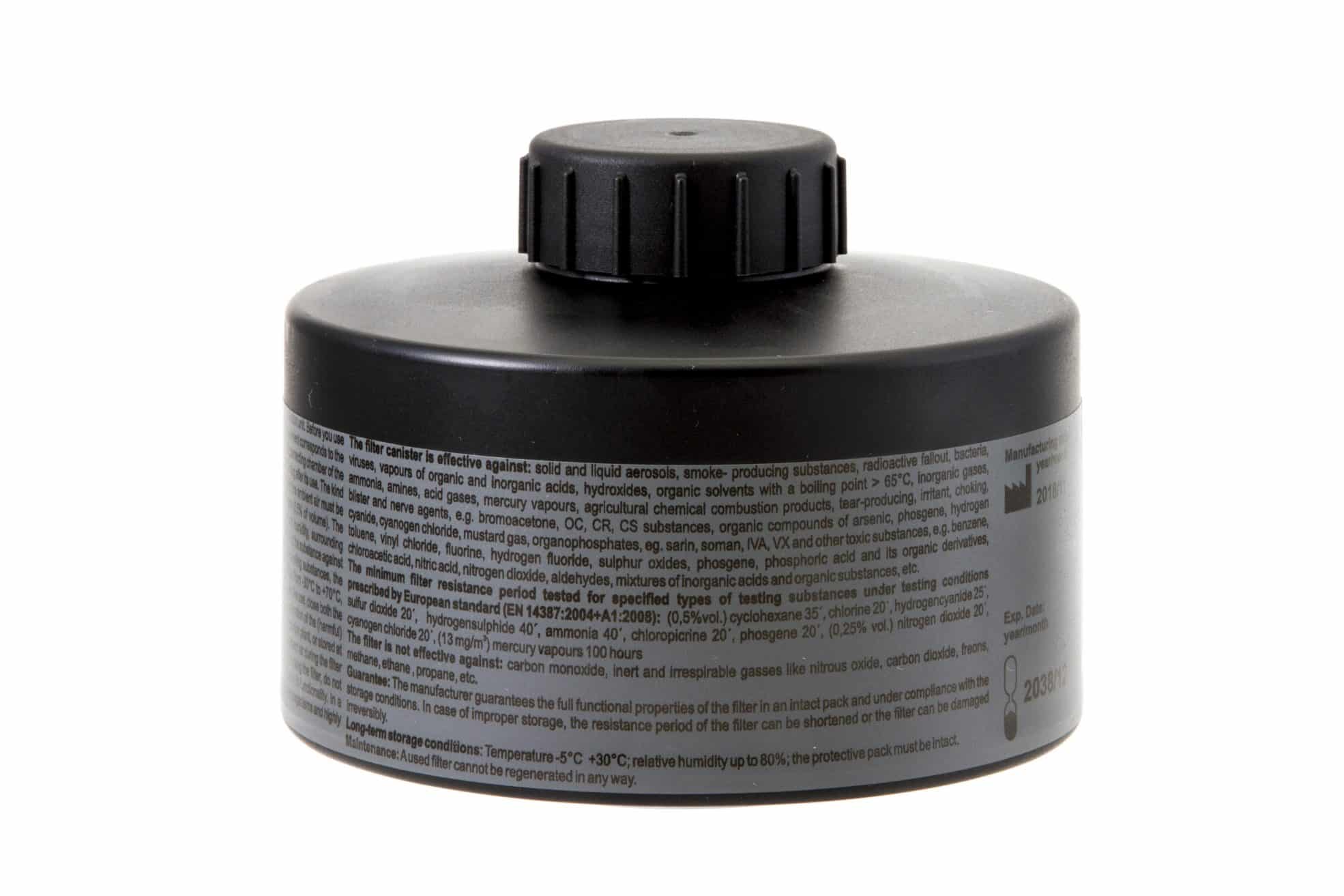 The filter canister in connection with a suitable respirator or PAPR provides protection against solid and liquid particles, pepper spray (OC), smoke-producing substances, radioactive particles, bacteria and rickettsia, fungi, toxins, viruses, riot control agents (lachrymators, sternutators, vomiting agents), blister agents (vesicants), choking agents, blood agents, nerve agents, incapacitants, herbicides, pesticides, and TIC, such as bromoacetone, CS, CR, CN, CNC, CNS, CA substances, organic compounds of arsenic - diphenyldichlorarsine - CLARK I (DA), diphenylcyanoarsine - CLARK II (DC), adamsite (DM), diphenyldichlorarsine (DA), ethyldichlorarsine (ED), methyldichlorarsine (MD), mustard gas (H), sulphur mustard gas (HD), T-mustard gas, Q-mustard gas, nitrogen mustard gases (HN1, HN2, HN3), lewisite (L), mixed mustard gas (H-L), phosgene oxime (CX), phosgene (CG), diphosgene(DP), chloropicrin (PS), hydrogen cyanide (AC), cyanogen chloride (CK), arsine (SA), G-agents: sarin (GB), cyclosarin (GF), soman (GD), tabun (GA), IVA (GV), V-agents: VX, VR, VE, VG (amiton), VM and toxic industrial chemicals such as: fumes of organic or inorganic acids, hydroxides, organic solvents with a boiling point above 65° C, ammonia, amines, inorganic and acid gases, agricultural chemical combustion gases, other toxic substances, e.g. benzene, toluene, vinyl chloride, fluorine, hydrogen fluoride, sulphur oxides, chloroacetic acid, aldehydes, mixtures of inorganic acids, and organic substances, mercury vapors, radioactive iodine, organic compounds of iodine (Iodomethane, 129, 131), radioactive particles, etc.