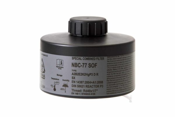 The NBC-77 SOF filter canister, in combination with a full-face mask, mouthpiece assembly, or PAPR, reliably protects air passages against a wide range of harmful and highly toxic substances including all known CBRN agents.