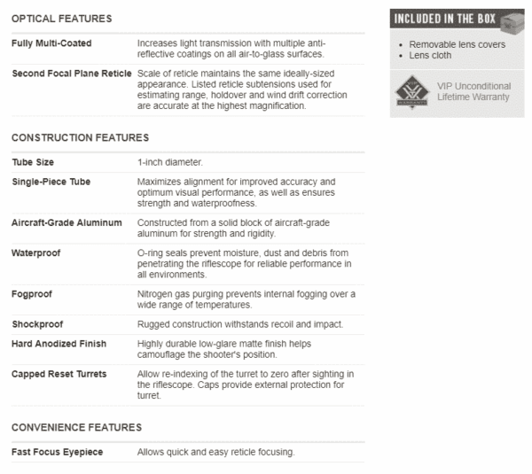 | Waterproof | O-ring seals prevent moisture, dust and debris from penetrating the riflescope for reliable performance in all environments. |