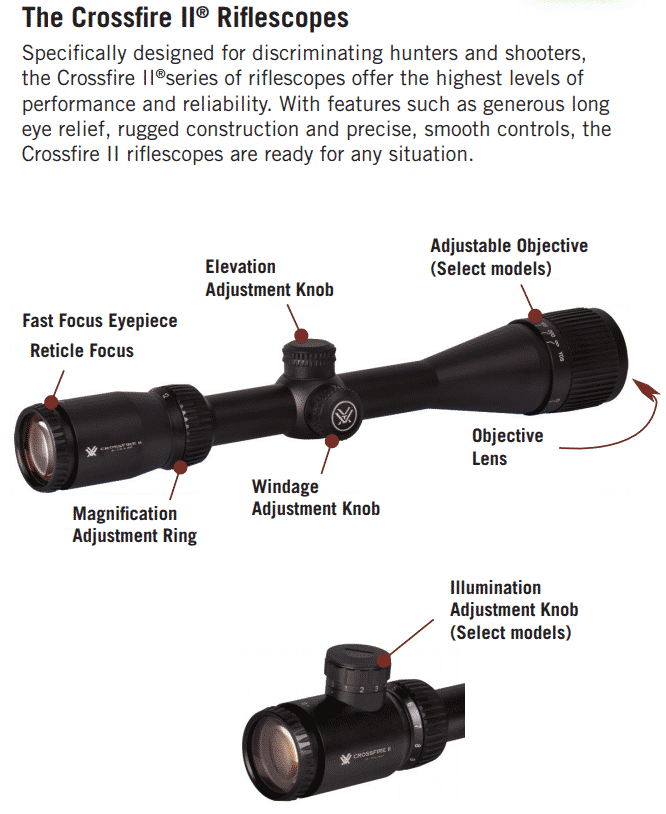With long eye relief, a fast-focus eyepiece, fully multi-coated lenses and resettable MOA turrets, there's no compromising on the Crossfire II. Clear, tough and bright, this riflescope hands other value-priced riflescopes their hat. The hard anodized single-piece aircraft-grade aluminum tube is nitrogen purged and o-ring sealed for waterproof/fogproof performance.