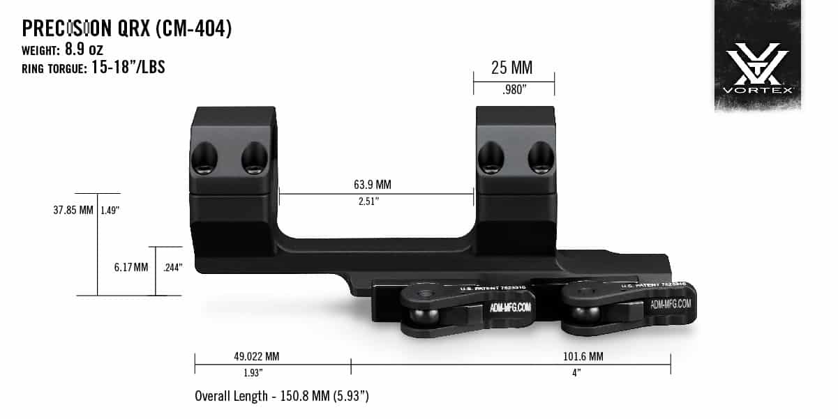 This mount positions the center of the riflescope tube at a height of 1.45 inches (37 mm) from the top surface of the Picatinny base. Ring screw bit size is 9/64” hex head. Weighs 8.9 ounces. Made with pride in the U.S.A.