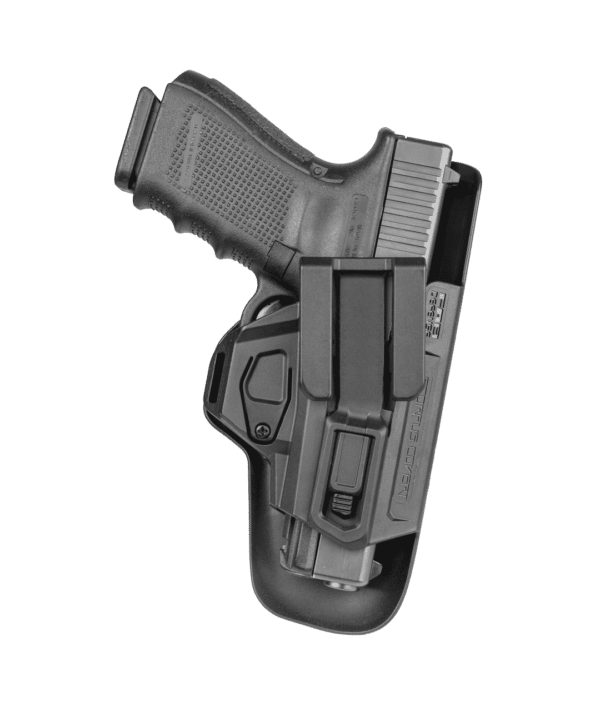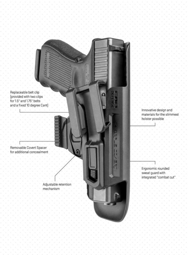 This FAB Defense holster is made to offer a higher degree of modularity over other holsters. This includes a removable Covert Spacer that pushes the FAB Defense holster and gun closer to the body for maximum concealment. The belt clip is removable, and the holster includes a clip for 1.5 inch and 1.75-inch belts. The holster is tuckable and allows the user to maintain a professional appearance with a concealed weapon.