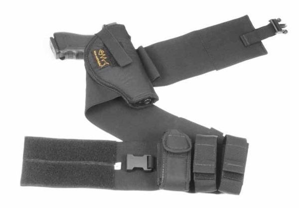 Elastic Ballistic Nylon Belt. Accessories sewn to belt include gun holster, duty cuff and double pistol magazine pouch
