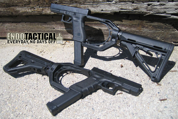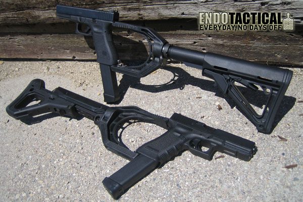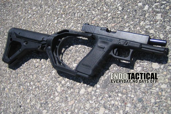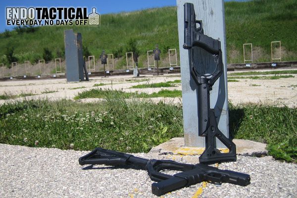 - Reduces shooter fatigue by re-distributing the felt recoil and weight of the handgun