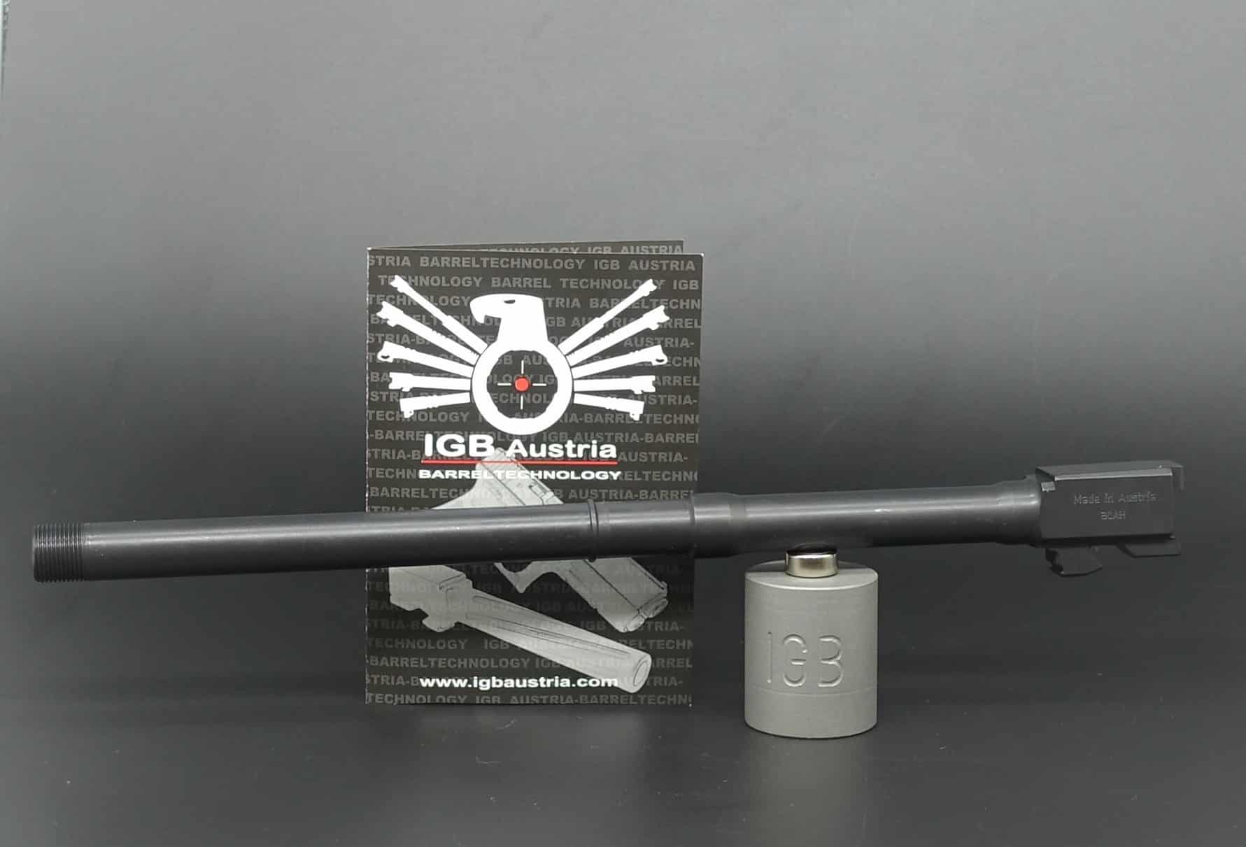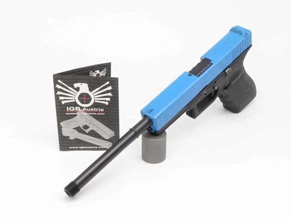 The Impulse System was developed to eQualityuip pistols, which dispose of a Browning type lockup (i.e. Glock, Colt, CZ ) with barrels up to 42 cm (16") length. Moreover, these units offer for the first time the advantage of using compensators or longer match barrels in combination with target loads. Abb. Glock 17 with IGB 10" barrel and matching shroud.