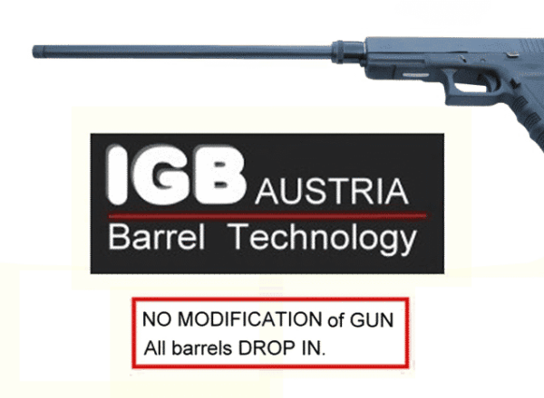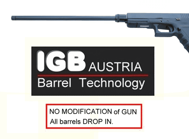 The Impulse System was developed to eQualityuip pistols, which dispose of a Browning type lockup (i.e. Glock, Colt, CZ ) with barrels up to 42 cm (16") length. Moreover, these units offer for the first time the advantage of using compensators or longer match barrels in combination with target loads. Abb. Glock 17 with IGB 10" barrel and matching shroud.
