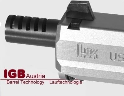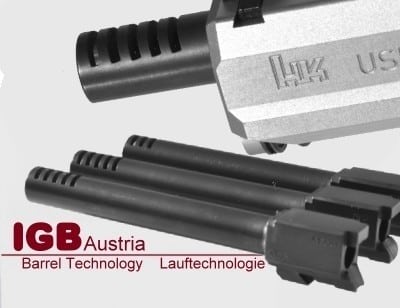 The IGB muzzle ported barrel is an extended barrel with slits/ports on the upper side at the muzzle. This way the barrel redirects gas power upwards and reduce of muzzle flip can clearly be felt. This way it is possible to target quicker and to shoot faster. IGB recommends this barrel specially to be used in a "carry pistol" as this barrel will fit a carry holster. A kompensator barrel as used in sport events is not usable with carry holsters.