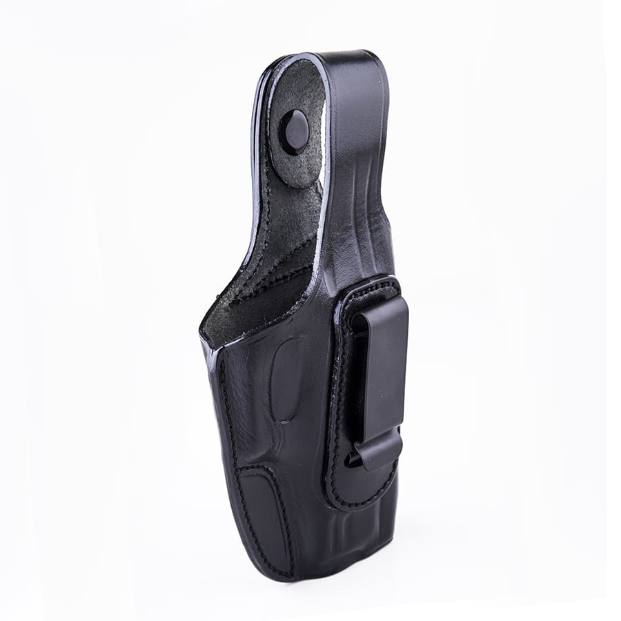 Classic inside Waist Band concealment. Attaches to the belt with a strong steel clip. Stiff enough to prevent the holster from being pulled off the belt even while drawing aggressively.