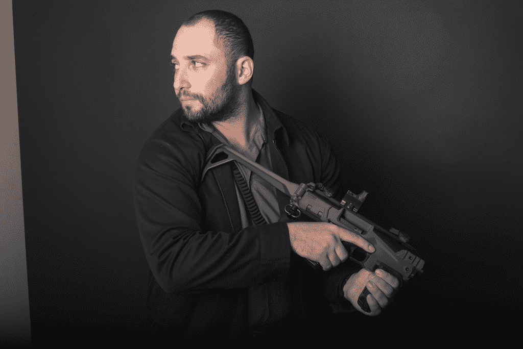 • Vertical foregrip folds to a horizontal position and incorporates an extendable trigger guard