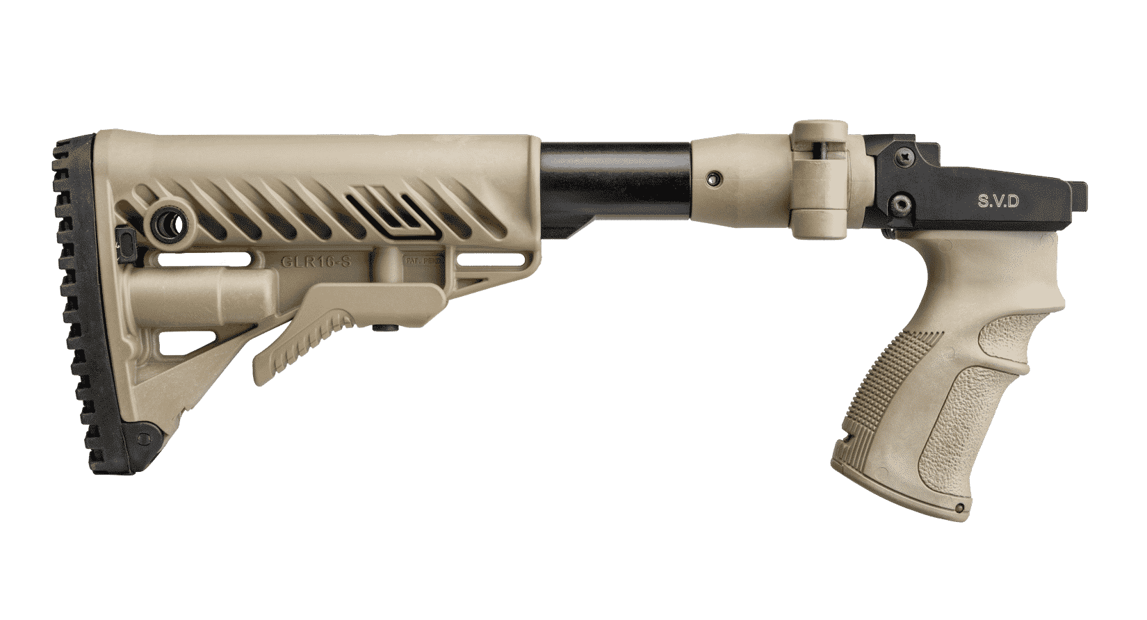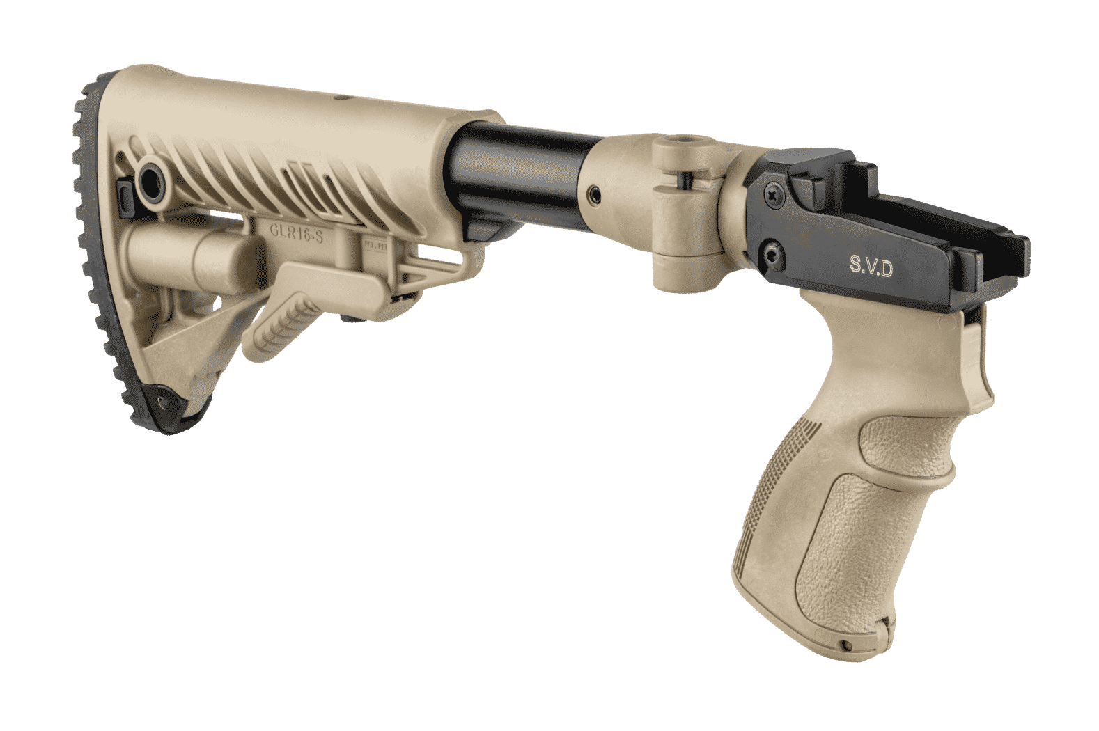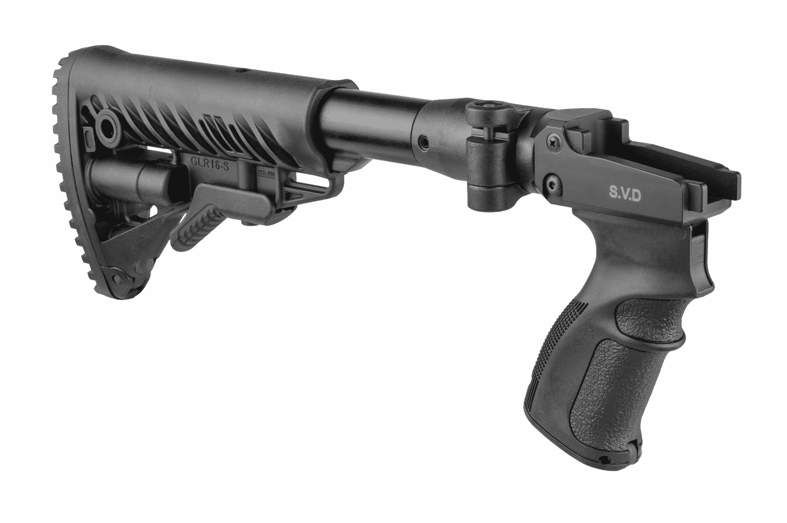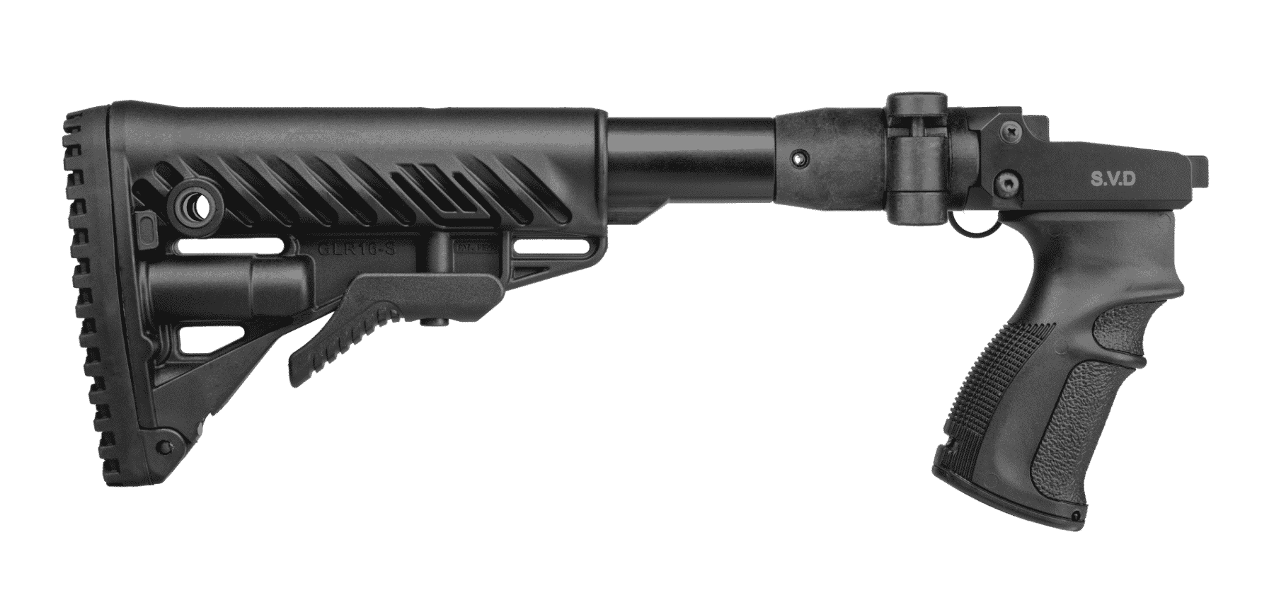 The M4 SVD is a combined folding and collapsible buttstock system with ergonomic pistol grip made for improved trigger operation, ergonomics, and overall performance of the Dragunov Sniper Rifle (Snayperskaya Vintovka Dragunova).