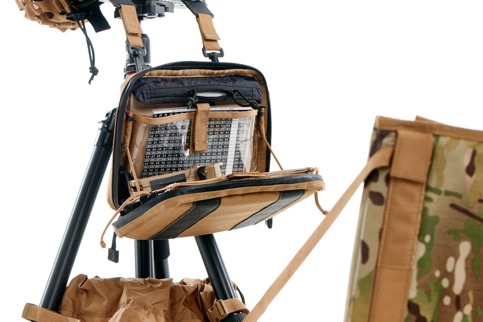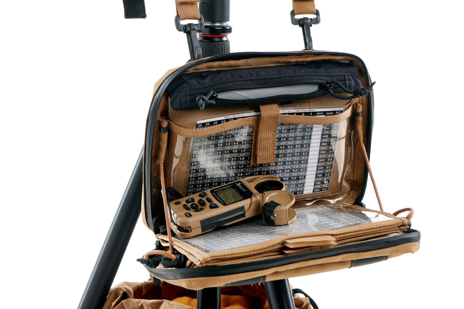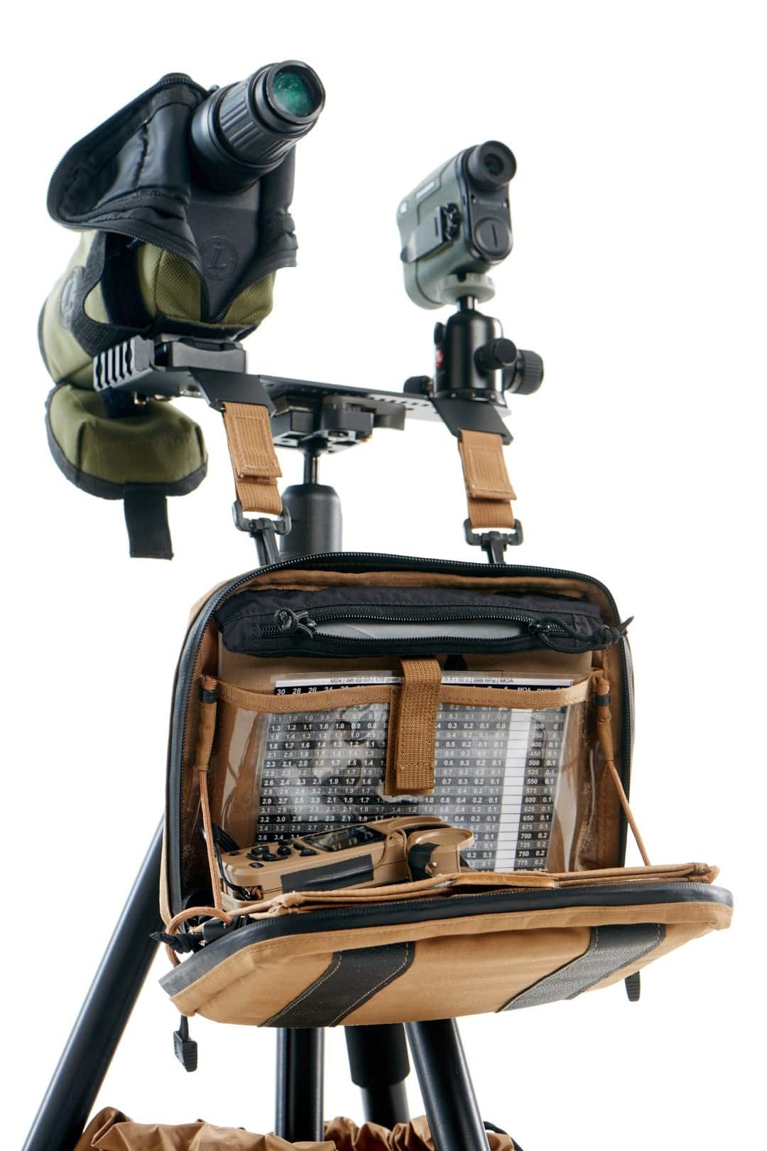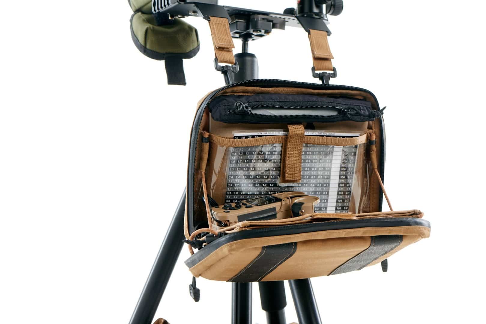 Allowing maximum comfort and time efficiency in the field. One platform for all observation devices such: observer scope, laser range finder, IR laser pointer, ballistic calculator, thermal camera and more. Adjustable in a matter of seconds so all devices point to the same spot. The optics tray moves all devices together. When the spotter finds the target, he can immediately range the distance without losing eye contact for more than one second. Fast connectors allow connecting the tactical binder to the tray for maximum comfort.