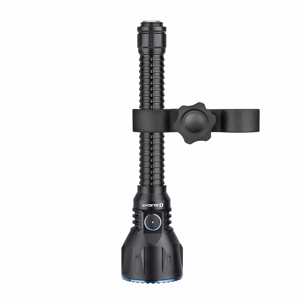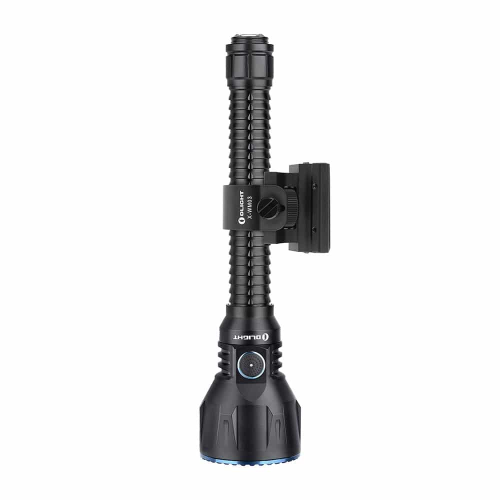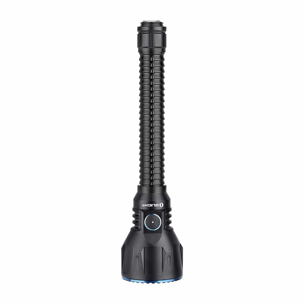 The Javelot Turbo is a dual-switch LED flashlight upgraded from Javelot Pro. Most of the great features of Javelot Pro are still there, including the throw, convenient side switch, integrated replaceable battery pack, power level indicator, and the 63mm bezel diameter. There are some new upgrades. The beam distance has been furthered from 1,080 to 1,300 meters. The two 5000mAh 21700 battery pack replaces the previous two 3500mAh 18650 battery pack. The signature 3-in-1 tail switch has been raised a little, just like that of Odin, to enable a more smooth tactical operation. As a result, now you can charge the product via a normal MCC3 charging cable, or lock it up with a ROD remote pressure switch. For sure, the Javelot Turbo is one of Olight’s best illumination tool for hunting or search and rescue.