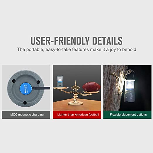 - 【Human-Oriented】Motion-sensitive battery indicator, fading on and off to help locate lantern in the darkness and showing the power level in three colors (Green: Power>70%, Orange: Power is between 30% and 70%; Red: Power<30%).The hanging hook and stable base make carrying, storing and decorating super handy.