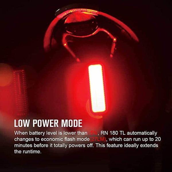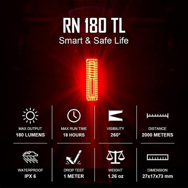 Featuring the latest light a motion sensors. RN 180 TL Will sense when a rider has engaged a sudden stop and will increase its output to 180 lumens in a frenzy of flashes, warning fellow travelers and motorists.