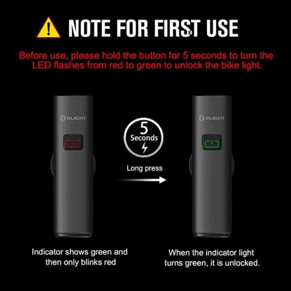 - 【Attention】Before use, please hold the button for 5 Seconds to unlock the bike light. Otherwise the button will flash red and the light will not turn on due to the built-in locking function.