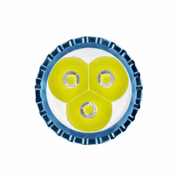 (1) Paired with three highly efficient cool white LEDs, delivering a maximum output of 3,000 lumens and a beam distance of 220 meters.