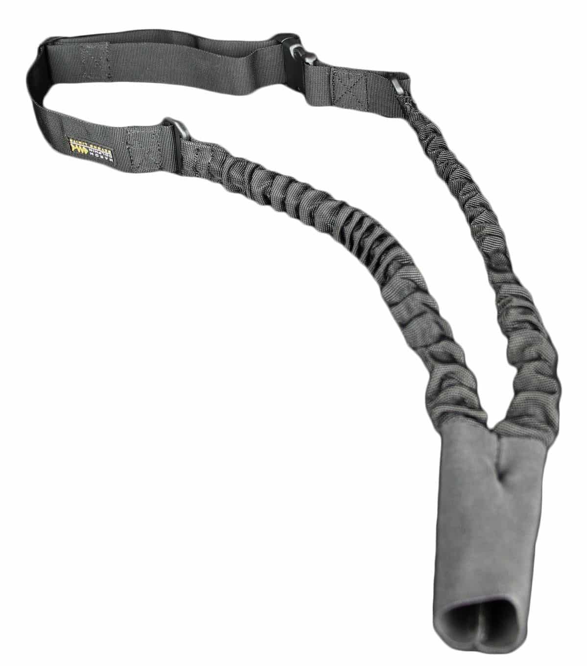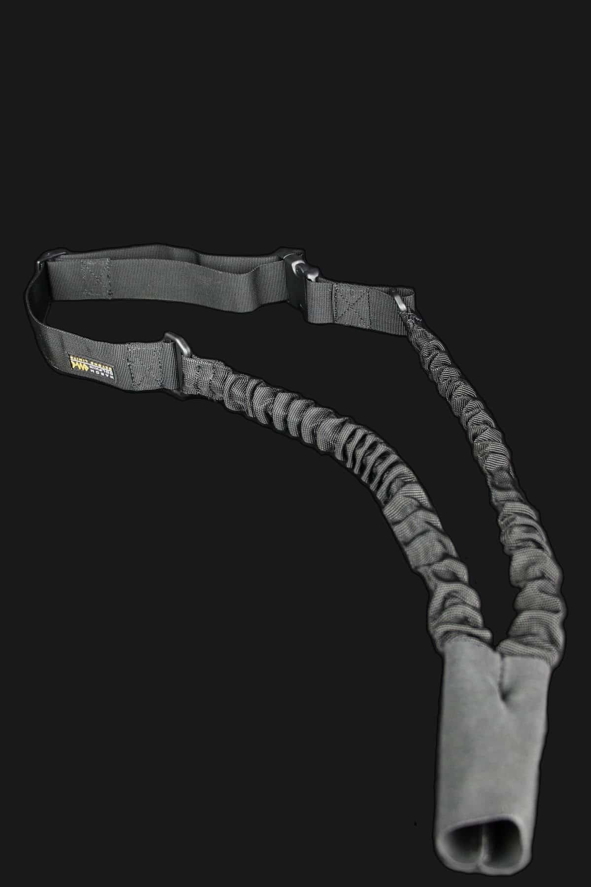 A high quality weapon sling with an elastic mechanism (bungee), in a one-point connection to the weapon.