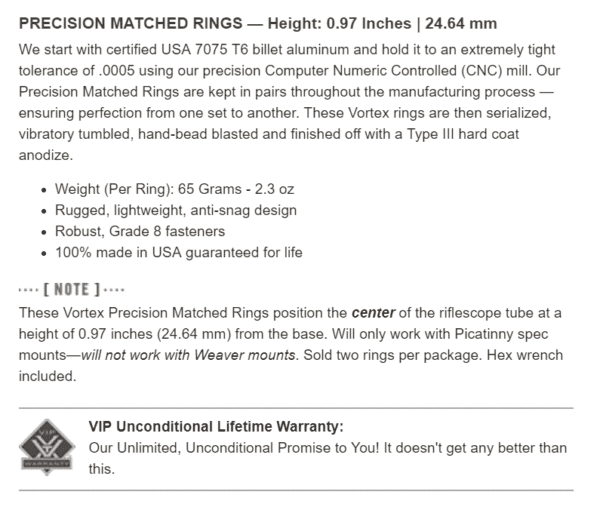 These Vortex Precision Matched Rings position the center of the riflescope tube at a height of 0.97 inches (24.64 mm) from the base. Will only work with Picatinny spec mounts—will not work with Weaver mounts.