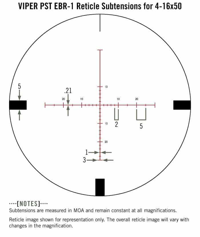 Subtension detail for the Viper PST 4-16x50 FFP riflescope with EBR-1 MOA reticle.>