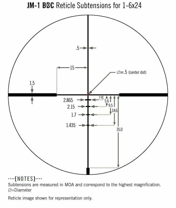 The VMR-2 is a hashmarked ranging reticle with an illuminated center dot that uses MOA-based subtension lines for ranging, holdover and windage corrections.