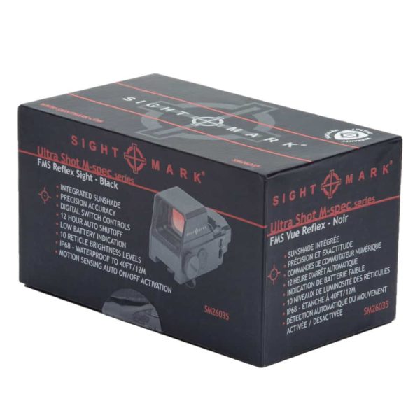 Specially designed to handle your hardcore shooting needs, the Sightmark Ultra Shot M-Spec FMS Reflex Sight promises repeatable accuracy, ultra-fast target acquisition and rugged mil-spec reliability in virtually any environment. The Ultra Shot M-Spec?s premium wide-angle lens system with scratch resistant and anti-reflective red coating, patent-pending integrated sunshade, illuminated red 65-MOA circle-dot reticle with 10 brightness settings, night vision brightness modes, parallax correction (beyond 10 yards) and unlimited eye relief deliver a crisp, robust field of view and uncompromising reliability, even in low light and when perfect sight alignment isn?t an option. Built tough, the Ultra Shot M-Spec Reflex Sight is shock proof, dustproof, IP68 waterproof, recoil rated up to .50 BMG. and constructed of a rugged, lightweight 6061-T6 aluminum hood and protective shield. 1 MOA windage and elevation adjustments, up to 120 MOA of travel, get you on target quickly while the Interlock internal locking adjustment system and a single CR123A battery keeps you there with a battery life of 200 ? 2,000 hours. The Ultra Shot M-Spec FMS Reflex Sight also features locking picatinny mount, low battery indicator, motion sensing auto on/off activation, digital switch controls, 12-hour auto shut-off and Sightmark?s lifetime warranty. The Ultra Shot M-Spec LQD Reflex Sight is also perfectly compatible with the Sightmark XT-3 Tactical Magnifier (SM19062). Includes adjustment tools, CR123A battery, operation manual and neoprene cover.