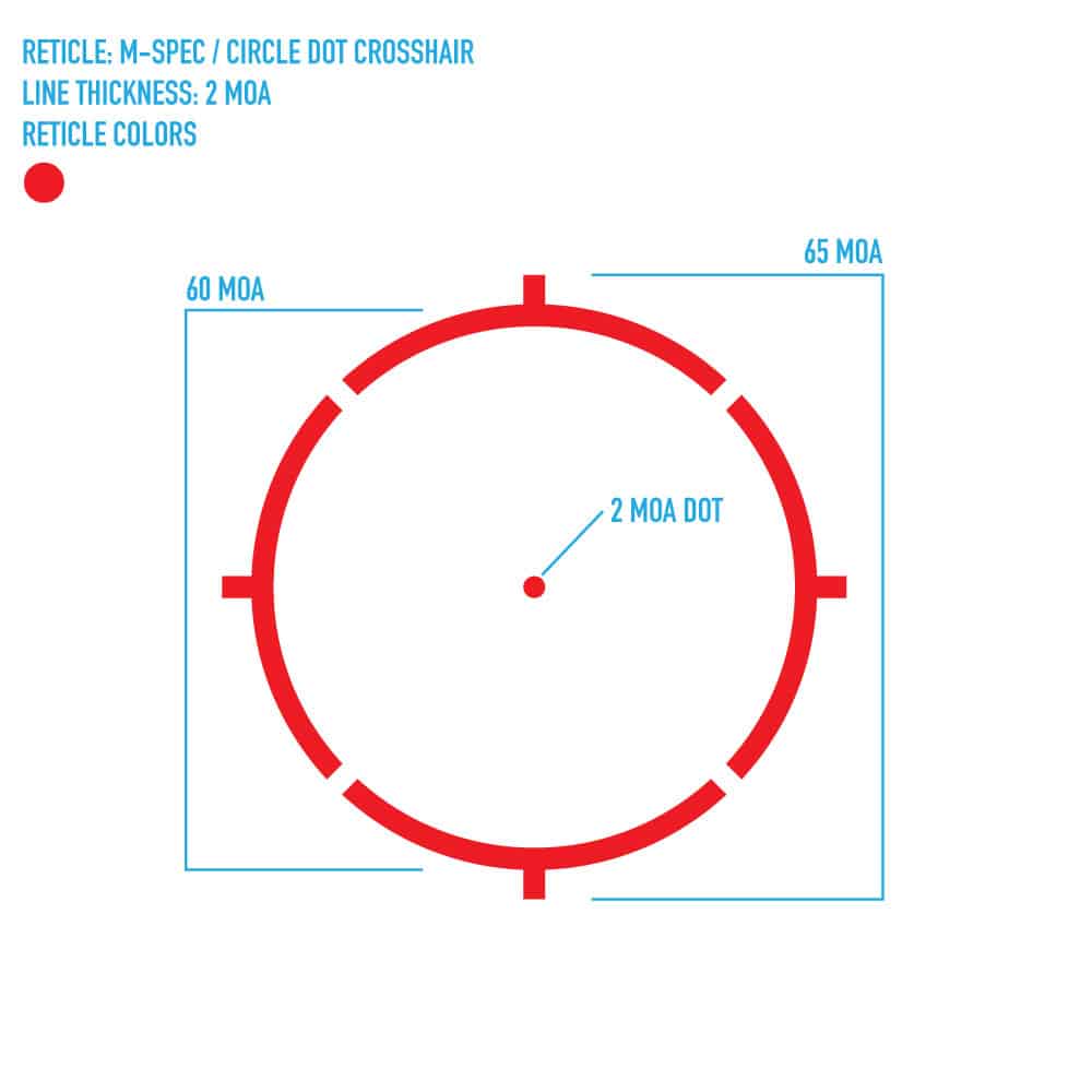 | Reticle, Type | 65 MOA Circle Dot Crosshair (60 MOA circle w/ 5 MOA subtension, 2 MOA central dot) |