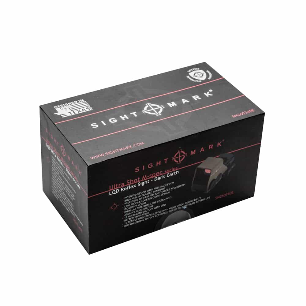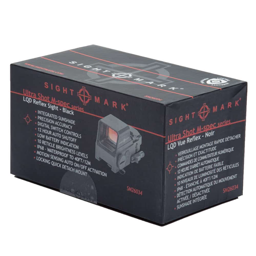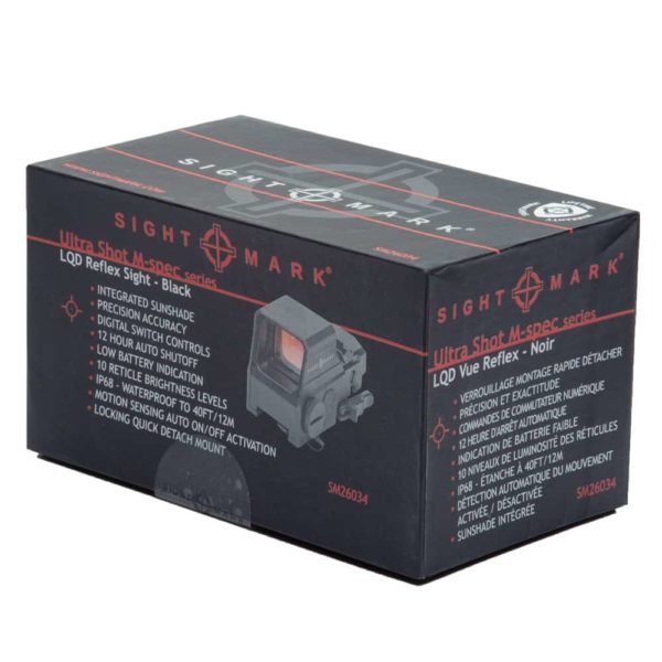 Specially designed to handle your hardcore shooting needs, the Sightmark RAM Series Ultra Shot M-Spec LQD Reflex Sight promises repeatable accuracy, ultra-fast target acquisition and rugged mil-spec reliability in virtually any environment. The Ultra Shot M-Spec?s premium wide-angle lens system with scratch resistant and anti-reflective red coating, patented integrated sunshade, illuminated red 65-MOA circle-dot reticle with 10 brightness settings, night vision brightness modes, parallax correction (beyond 10 yards) and unlimited eye relief deliver a crisp, robust field of view and uncompromising reliability, even in low light and when perfect sight alignment isn?t an option. Built tough, the Ultra Shot M-Spec Reflex Sight is shockproof, dustproof, IP68 waterproof, recoil rated up to .50 BMG and constructed of a rugged, lightweight 6061-T6 aluminum protective shield and magnesium alloy body. 1 MOA windage and elevation adjustments, up to 120 MOA of travel, get you on target quickly while the Interlock internal locking adjustment system and a single CR123A battery keeps you there with a battery life of 200 ? 2,000 hours. The Ultra Shot M-Spec Reflex Sight also features a low battery indicator, motion sensing auto on/off activation, digital switch controls, 12-hour auto shut-off, locking quick-detach Picatinny mount and Sightmark?s lifetime warranty. The Ultra Shot M-Spec LQD Reflex Sight is also perfectly compatible with the Sightmark XT-3 Tactical Magnifier (SM19062). Includes adjustment tools, CR123A battery, operation manual and Neoprene cover.