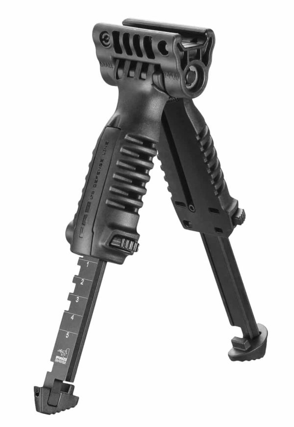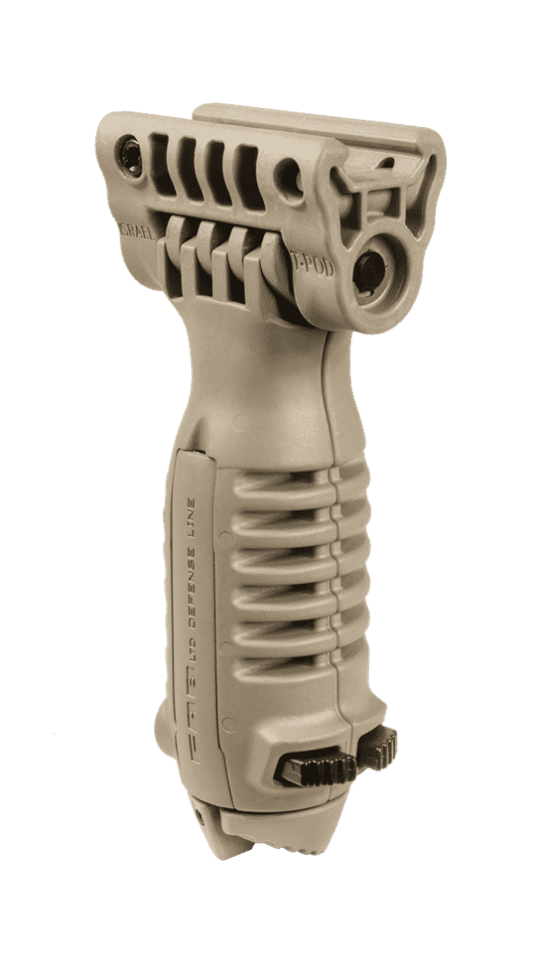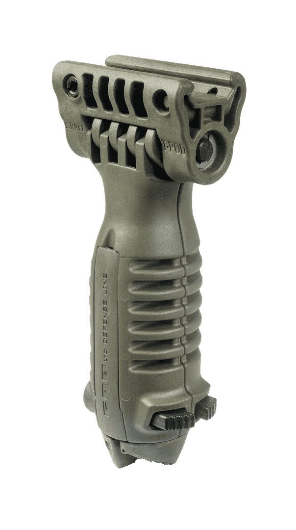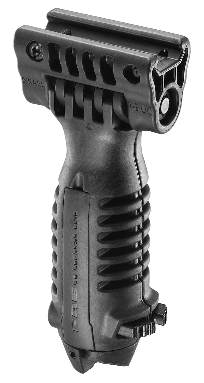 FAB Defense T-POD Tactical Foregrip & Bipod transforms from a foregrip to a full-function bipod with the push of a button and is a performance-enhancing accessory for any firearm fitted with a standard (underside) Picatinny rail. The Bipod allows for independent adjustment of each leg in 5 different length settings (each leg can be indivdually adjusted in steps of 11mm). The T-Pod Tactical Foregrip & Bipod is Ideal for sharpshooters and riflemen who are looking to enhance their accuracy and weapon stability without giving up the maneuverability aspect in a close quarter environment. Â