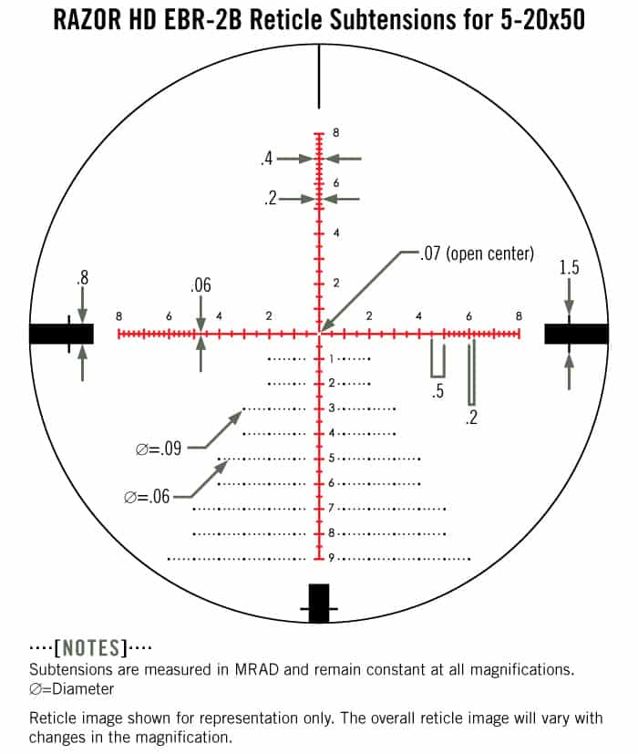 The EBR-2B (Enhanced Battle Reticle) is a ranging reticle using mrad-based subtension lines for ranging, holdover, and windage corrections. Heavier windage dot references on the drop lines increase visibility at all magnifications as well as during low light conditions. Numbered subtensions on the crosshairs ensure quick and easy referencing.