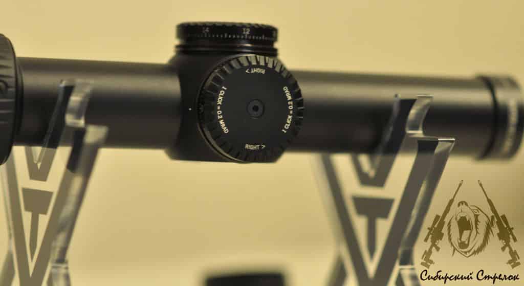 Turn the turret to the side needed for correction. One click of the tower moves the hit point to 2MRAD at a distance of 100 yards (approximately 2 cm at 100 meters). There is a version with a grid in the MOA, in which one click of the tower shifts the hit point to 0.5MOA at a distance of 100 yards (about 1.5 cm at 100 meters).