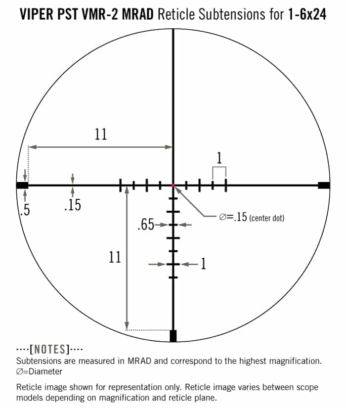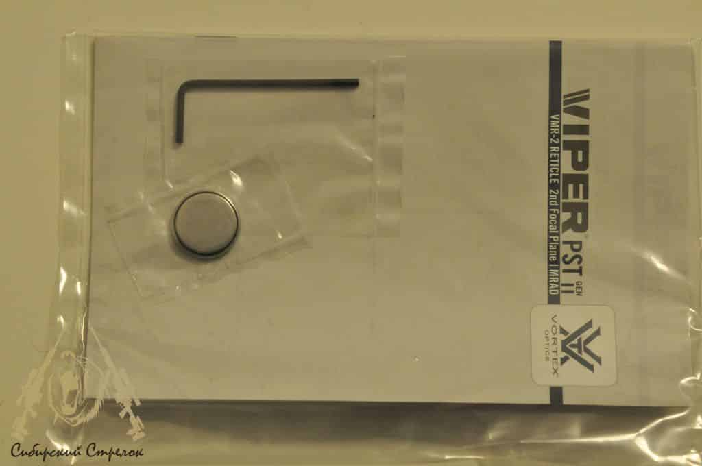 The scope is equipped with a proprietary VMR-2 reticle. This reticle is located in the second focal plane and is etched directly on the glass of the optical element. It also possible to illuminate the reticle central element for shooting at dusk and at night or another low light conditions. In total, the backlight levels are 10, while the mechanism for turning off the backlight in the intermediate position between different levels is realized. This feature saves time, as it prevents the disk from spinning until the backlight is turned off. With the minimum brightness parameters, it is possible to use this scope together with a night vision device.