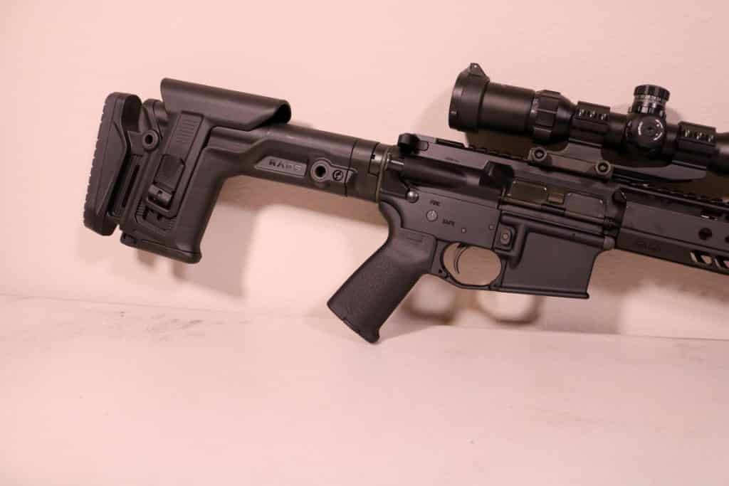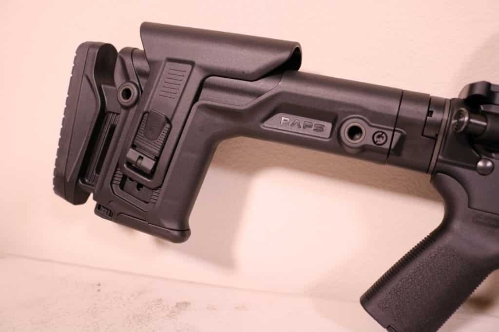 So, what is adjustable about this stock? The length of pull and the height of the check rest. The length of pull is adjustable to about 1.25 inches. This stock has a unique memory feature. With this you can position the stock where most comfortable for you, adjust the memory setting and now when you release the lever to deploy the stock, it will extend only a far as you’ve set it. While the height does not have the same memory feature as the butt-stock, this did not take away anything in the design of the RAPS from Fab Defense.